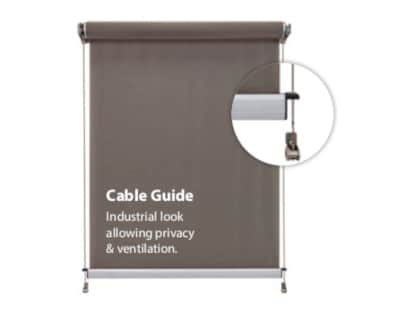 - Cable guide (or ‘wire guide’): As the name suggests, these blinds are guided by a stainless steel cable that runs from the top of the blind to the bottom of the blind’s travel. The advantage of the wire guide is that it allows the blind to be stopped at any position with the cables preventing the blind from blowing about in the wind.