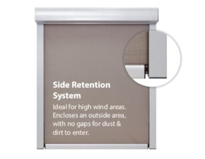 - Side Retention System: These blinds are also known by product names such as ZipScreen® and Ziptrak® . The fabric of the blind has a flexible zip welded or sewn into the sides. The zip runs in a channel at each edge of the blind. Side retained blinds have a number of benefits: flat looking fabric, exclusion of dust and insects, enclosure of outdoor areas and total privacy.